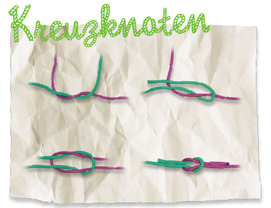 Um zwei Seile oder Bänder miteinander zu verbinden oder um ein Paket zu verschnüren, benutzt ihr am besten den Kreuzknoten. Er hält am besten zwischen zwei Leinen aus ähnlichem Material und mit ähnlichem Durchmesser.